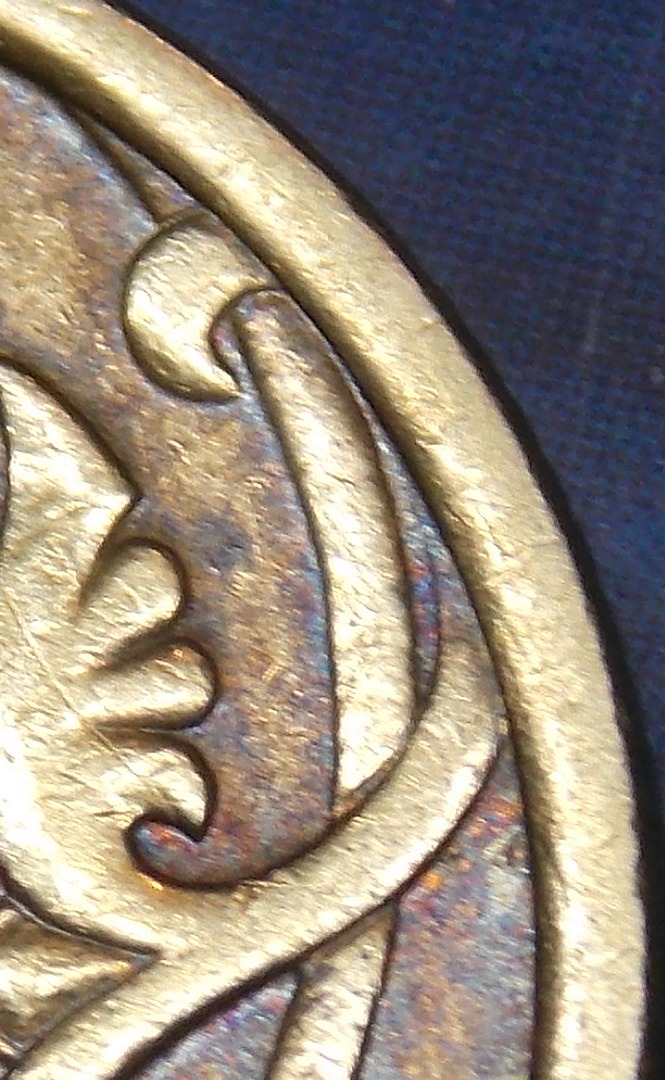 Да, есть такое. Но при этом левый внутренний контур цифры на обоих монетках без изменений, а правый контур, что внутренний, что наружный, на искомой монетке уменьшили ширину правой части нуля. Вывод - неравномерная подшлифовка, что прекрасно видно и по разнице рельефа завитков на 3-х часах.