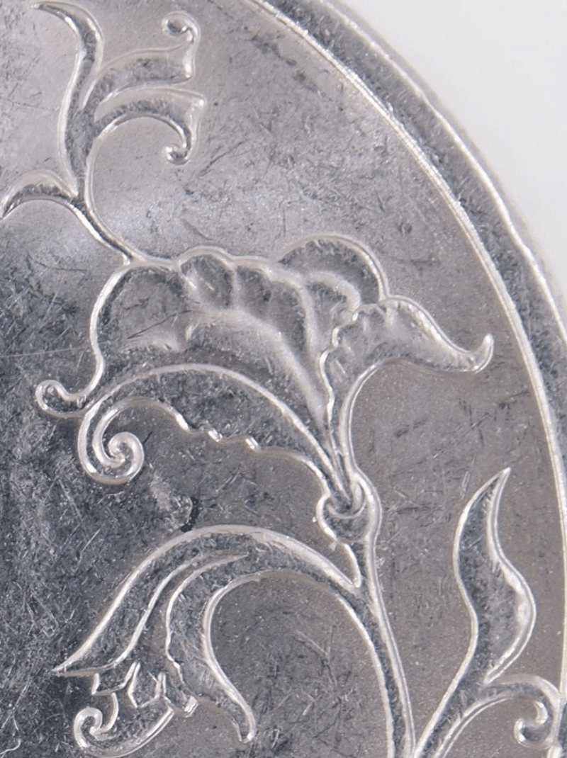 Я смотрю с направления, показанного чёрной стрелкой под углом 45 - 60 градусов к плоскости монеты - так виднее. Кроме того, участок границы рельефа под красной чертой прямой, если угол "острый". Если он "скруглён", этот участок слегка дугообразный - это довольно хорошо видно. Сравните.