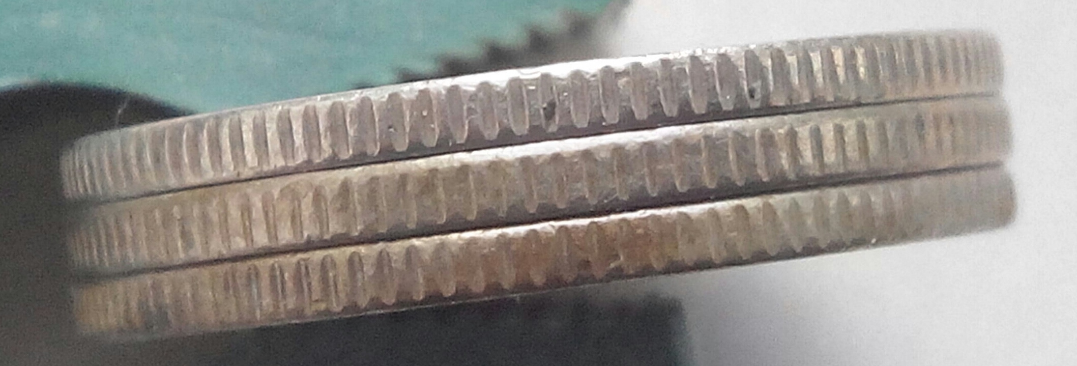 Вот ещё недавно попался рубль, также примерно 20,60 мм., но толще примерно на 0,1 мм., вес 3.41 грамм. Его гурт на фото нижний, верхний гурт от вышепоказанного здесь рубля 2008 года.