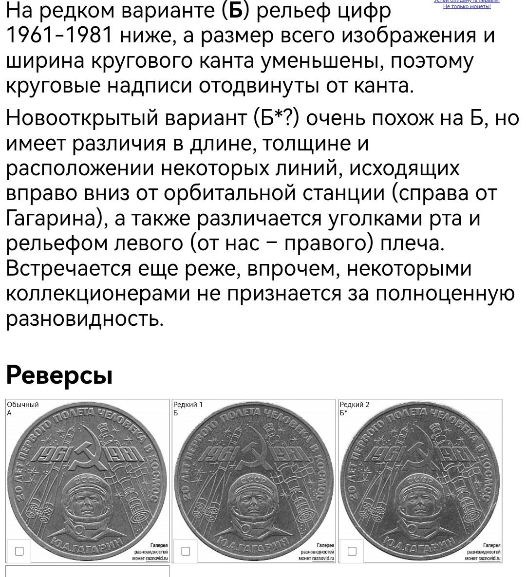 Доброго дня нашел информацию, что чте нечастый Гагарин различается на Шт-Б1 и Шт-Б2. Вот эти две монетки сравнил, увидел отличия только у уголков рта. Есть ли кто владеет более конкретной информации где еще про это можно прочитать. Или всё-таки правильно написано что третья разновидность это так же несчастный Шт-Б.
