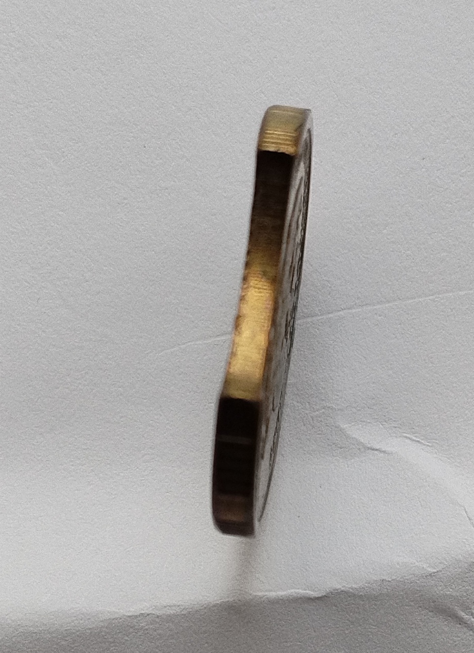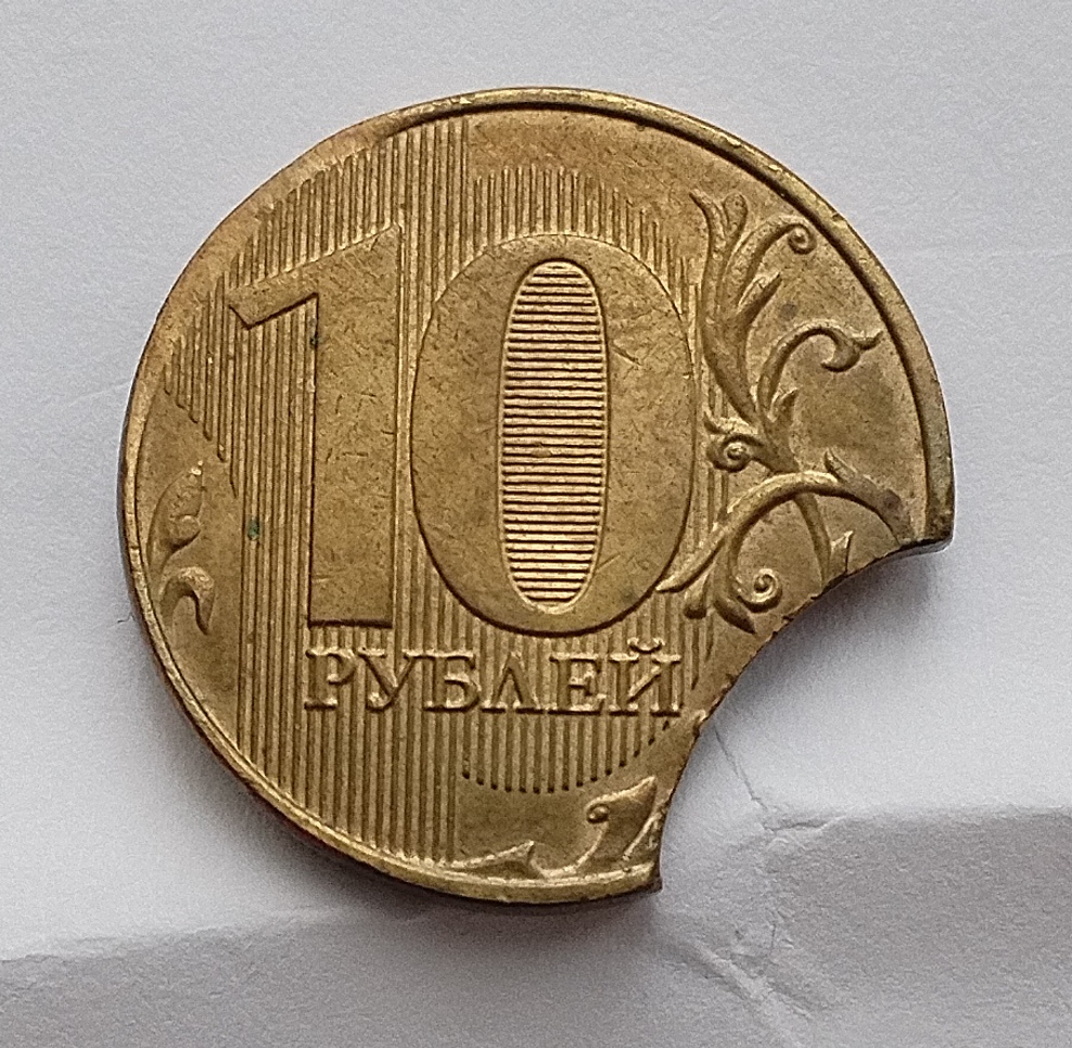 Десяточка с выкусом 2019 ммд, напротив выкуса имеется небольшой антивыкус, что говорит о подлинности монеты.Сам выкус покрыт гальваникой.