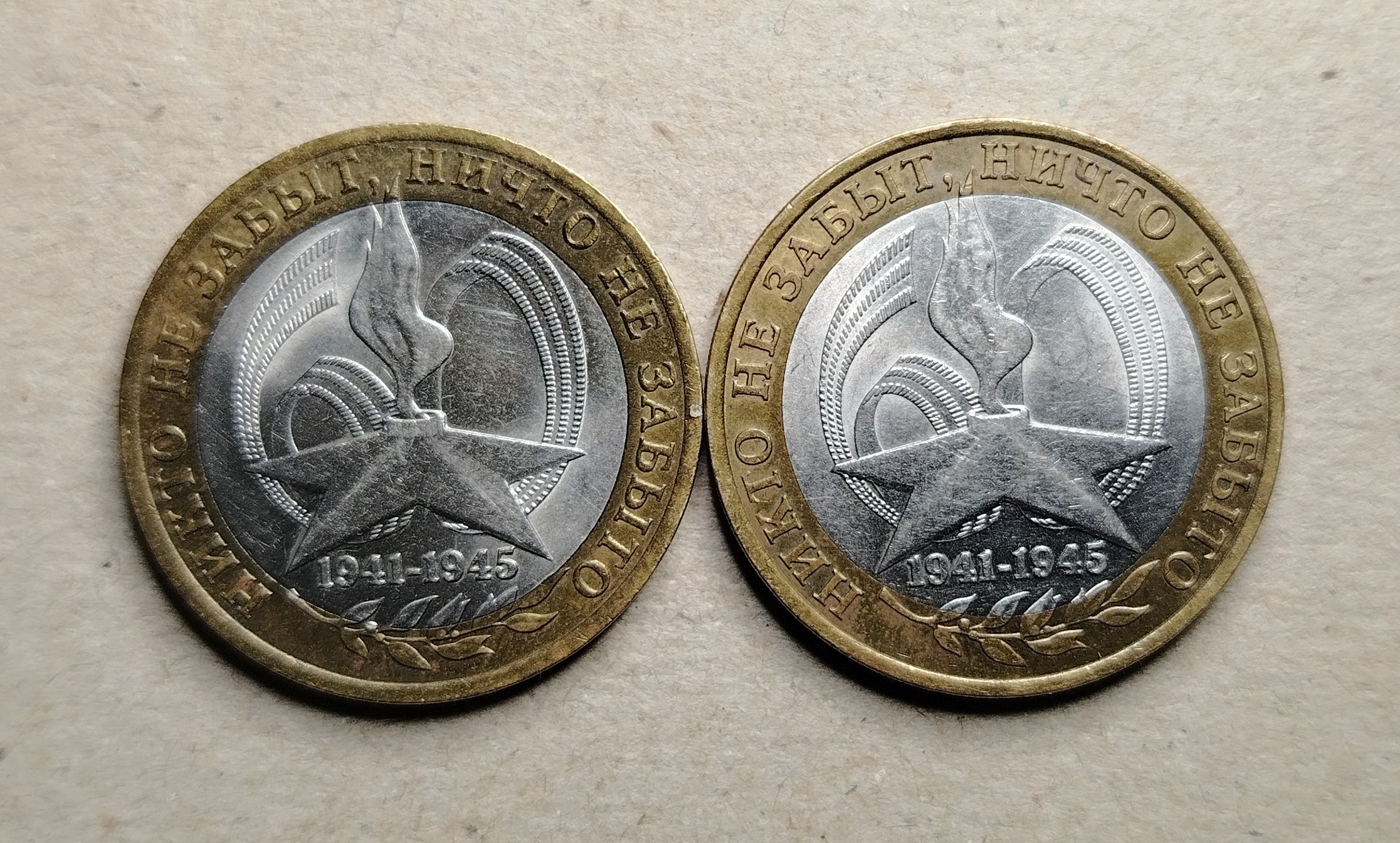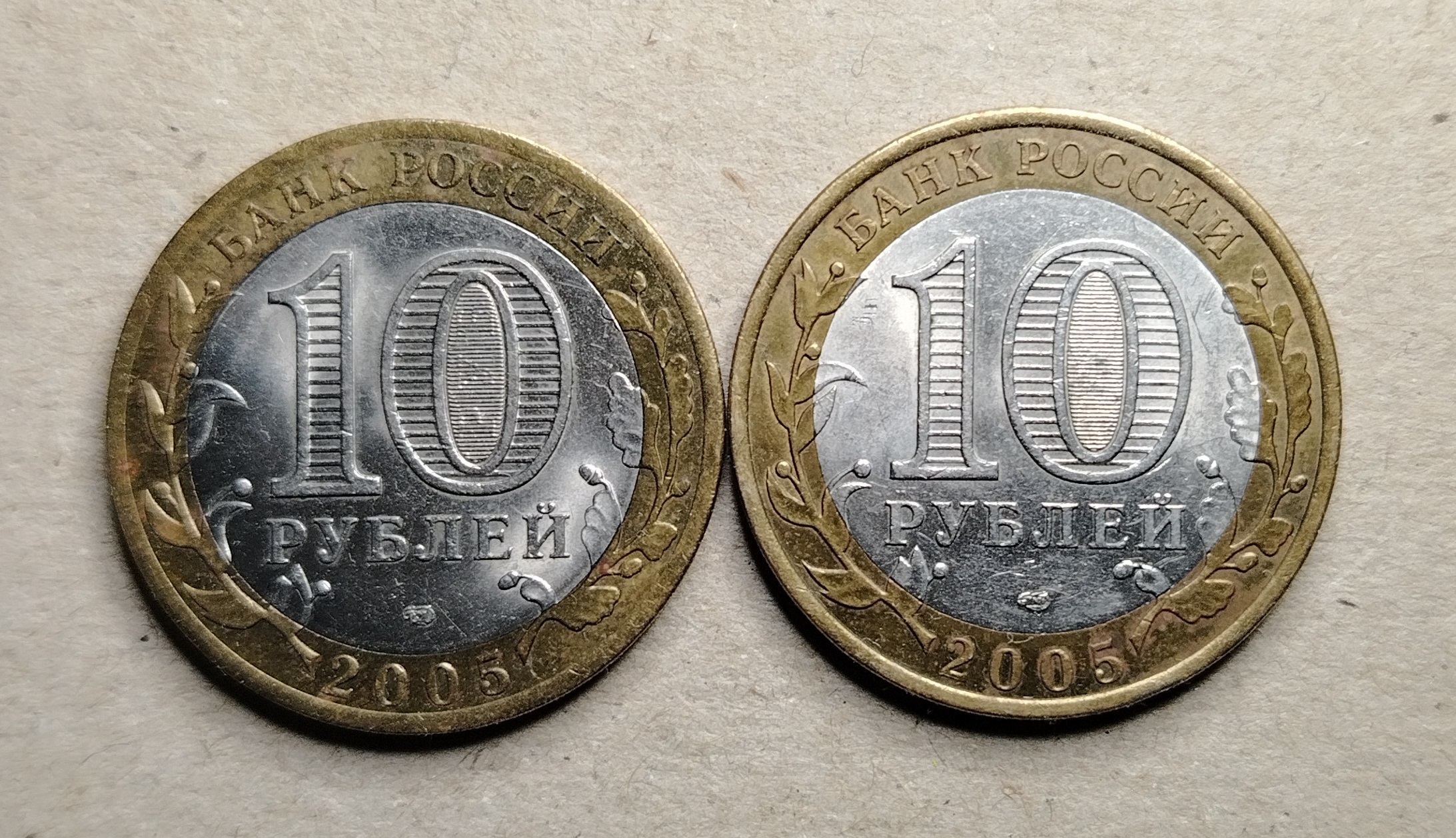 На реверсе левой монеты элементы изображения приближены к канту,у правой отдалены от канта(изображение чуток меньше).