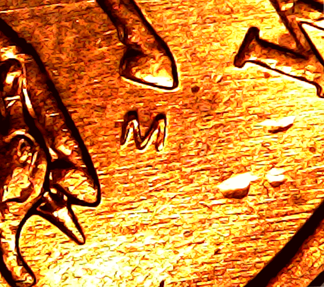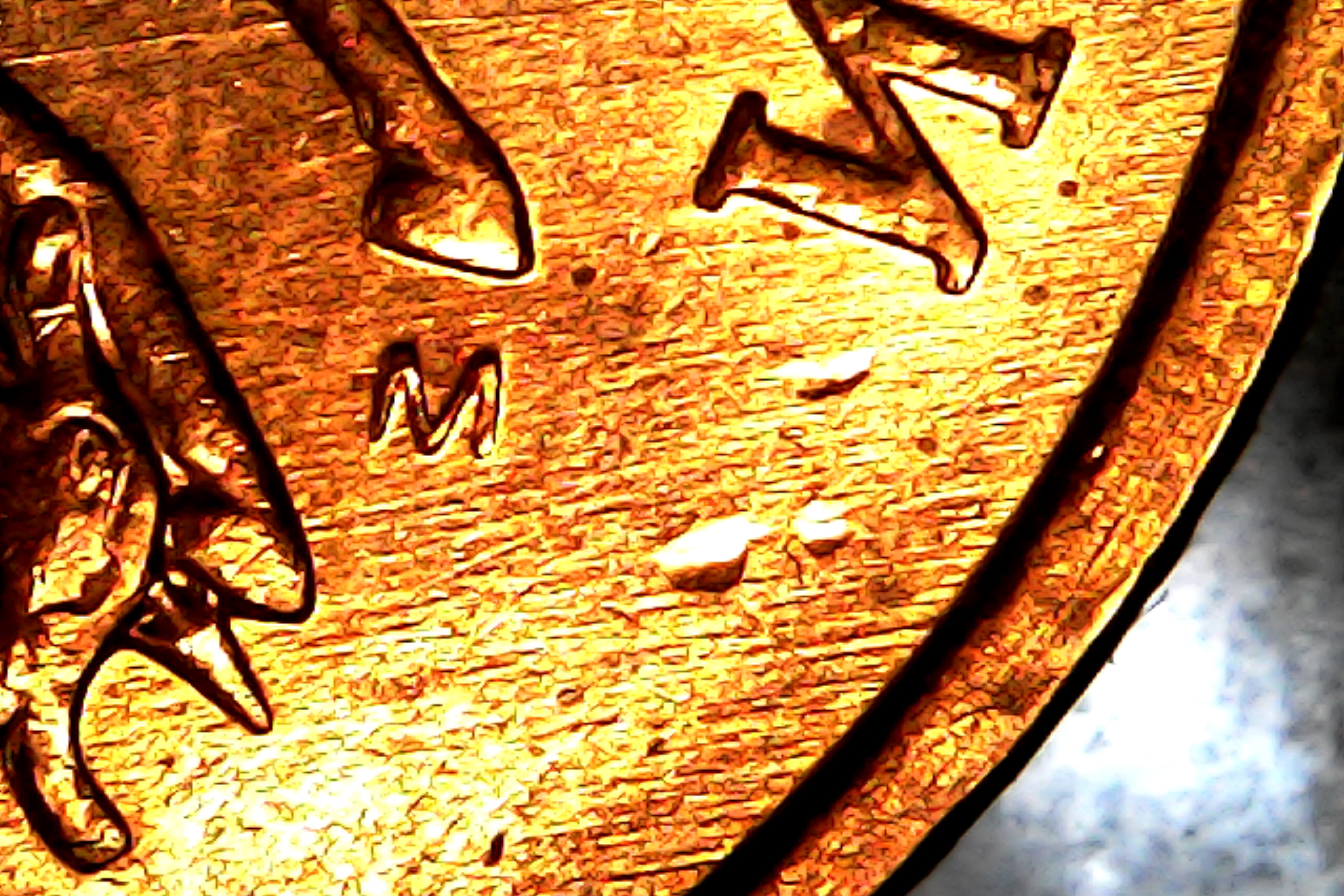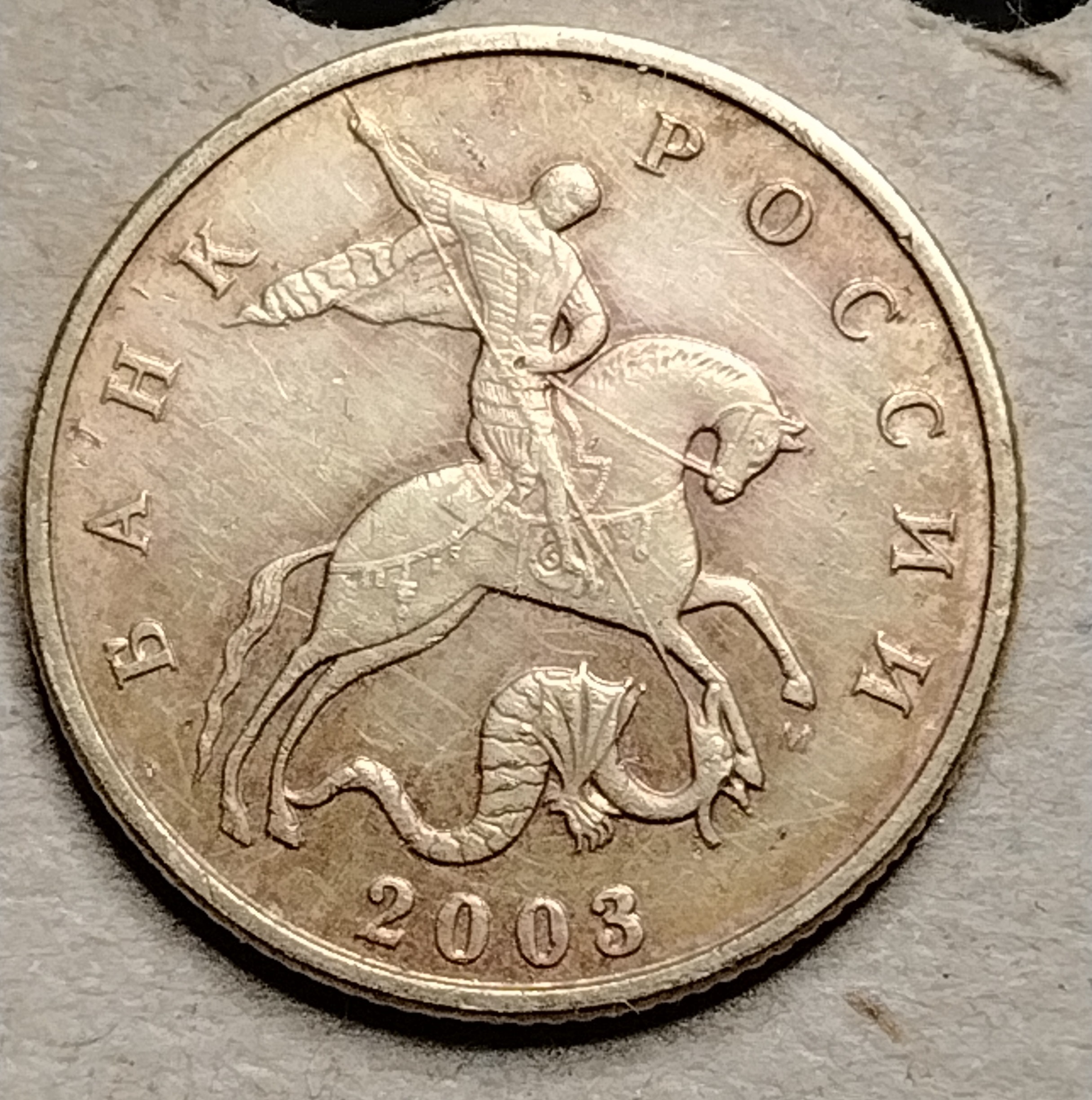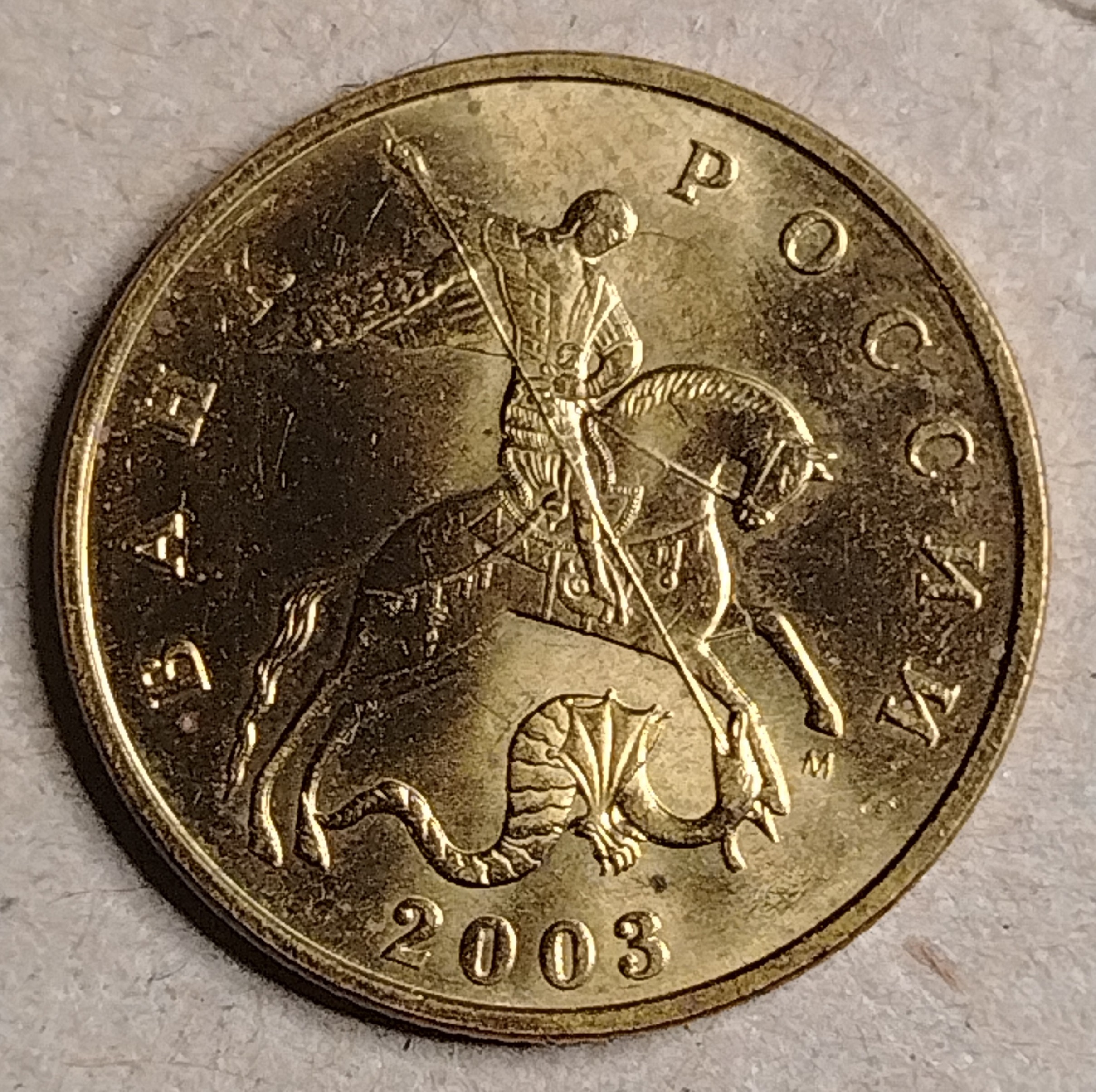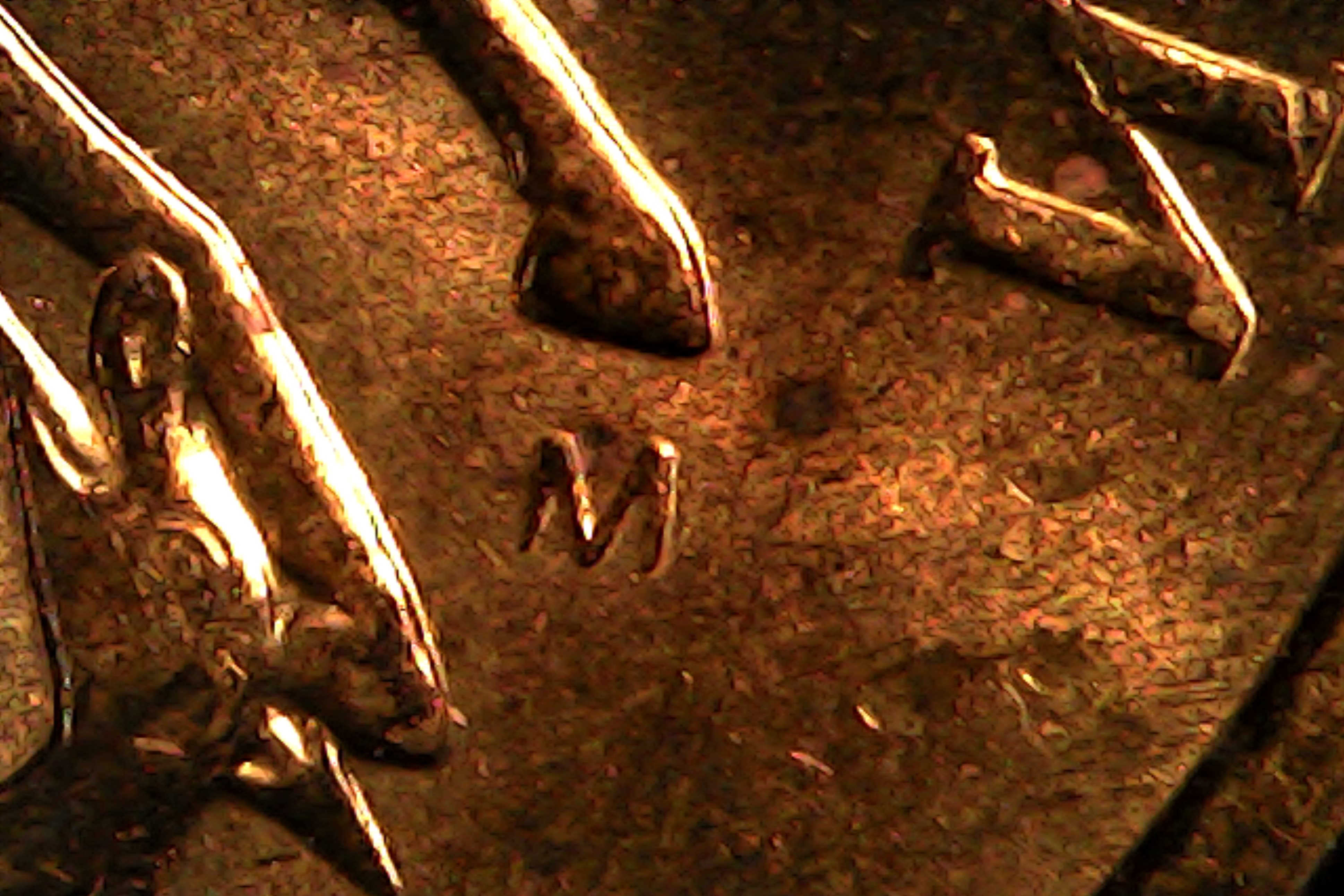Такие две монетки попались.На одной монете М ближе к середине копыта,на другой-к краю.