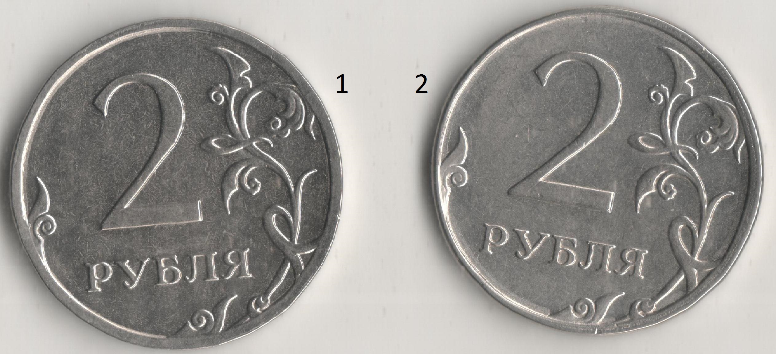 Всем доброго времени суток измерил. Мне кажется на монете №1 элементы расположены ближе к канту и буквы в слове "рубля" отличаются , а размер кажется одинаковый.