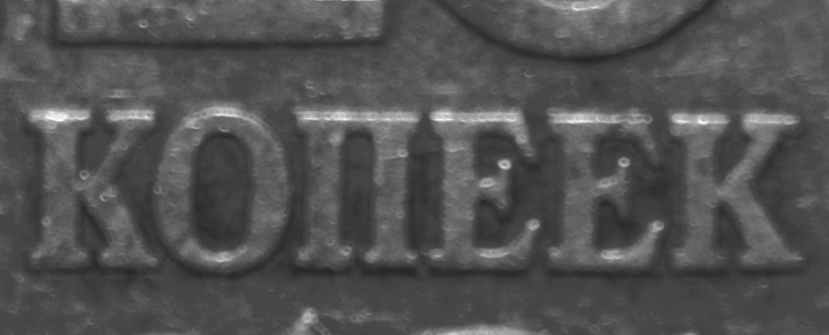Но по нему видно, что центр сильно зашлифован - смотрите, как выглядит правая сторона основания единицы номинала. И сравните её с левой стороной основания. И расстояние увеличено не только между ПЕ, но, например, в самой Е между различными перекладинами. Также можно сравнить просвет между нижними просечками буквы П.