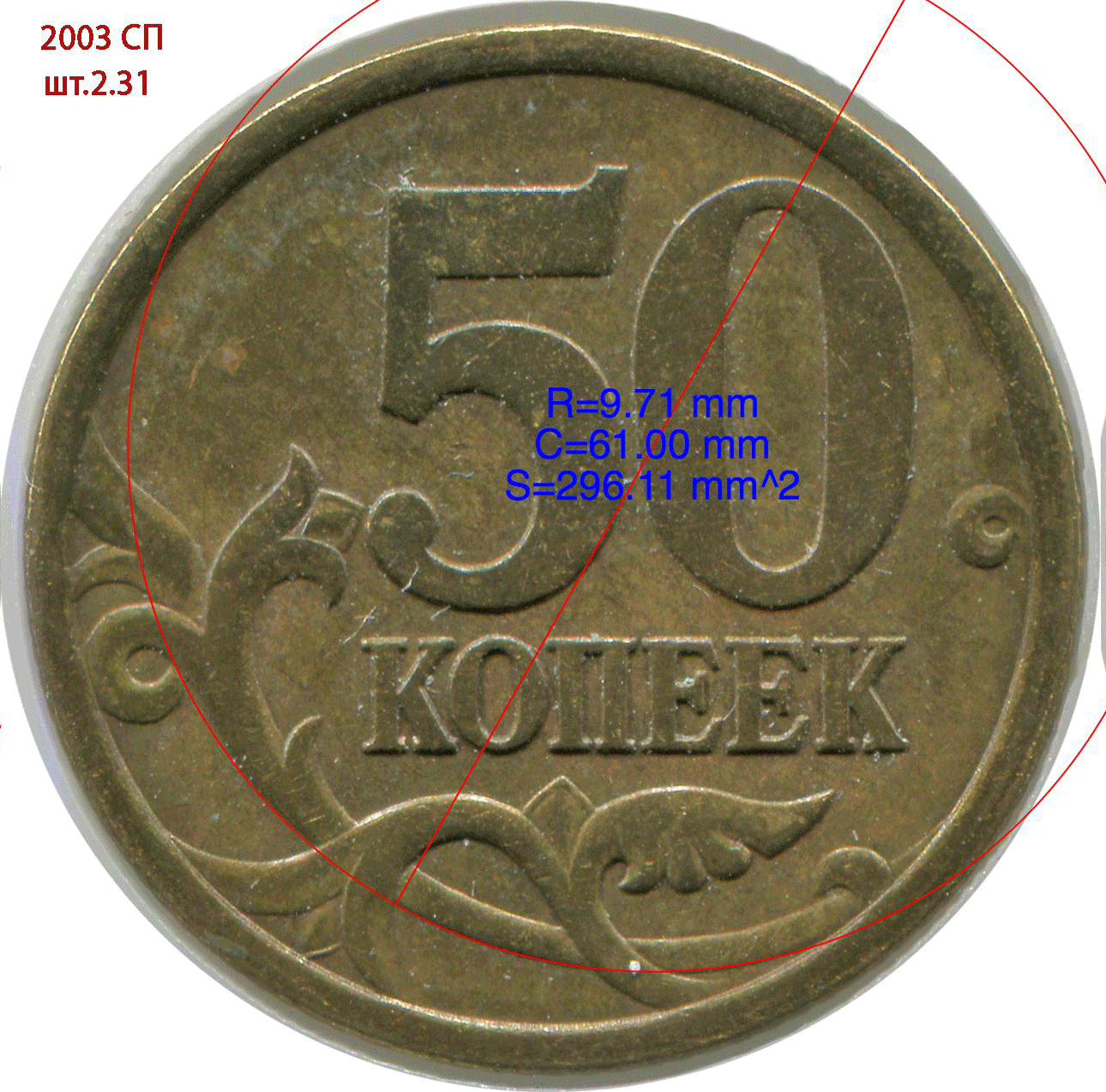 Выяснилось, что абсолютно все монеты шт. 2.31 и 2.32(2) в пределах одного года имели одинаковые размеры и стабильно отличались в размерах на полпроцента между 2004 и 2005. Также была выявлена устойчивая разница между этими годами в степени подхода изображения к канту, степени параллельности стеблей и, конечно, расстоянием между буквами «ПЕ».